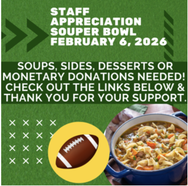Staff Appreciation Souper BowlFebruary 6, 2026 Soups, sides, desserts, or monetary donations are needed! Check out the links below and thank you for your support: Sign Up Genius: https://www.signup...
