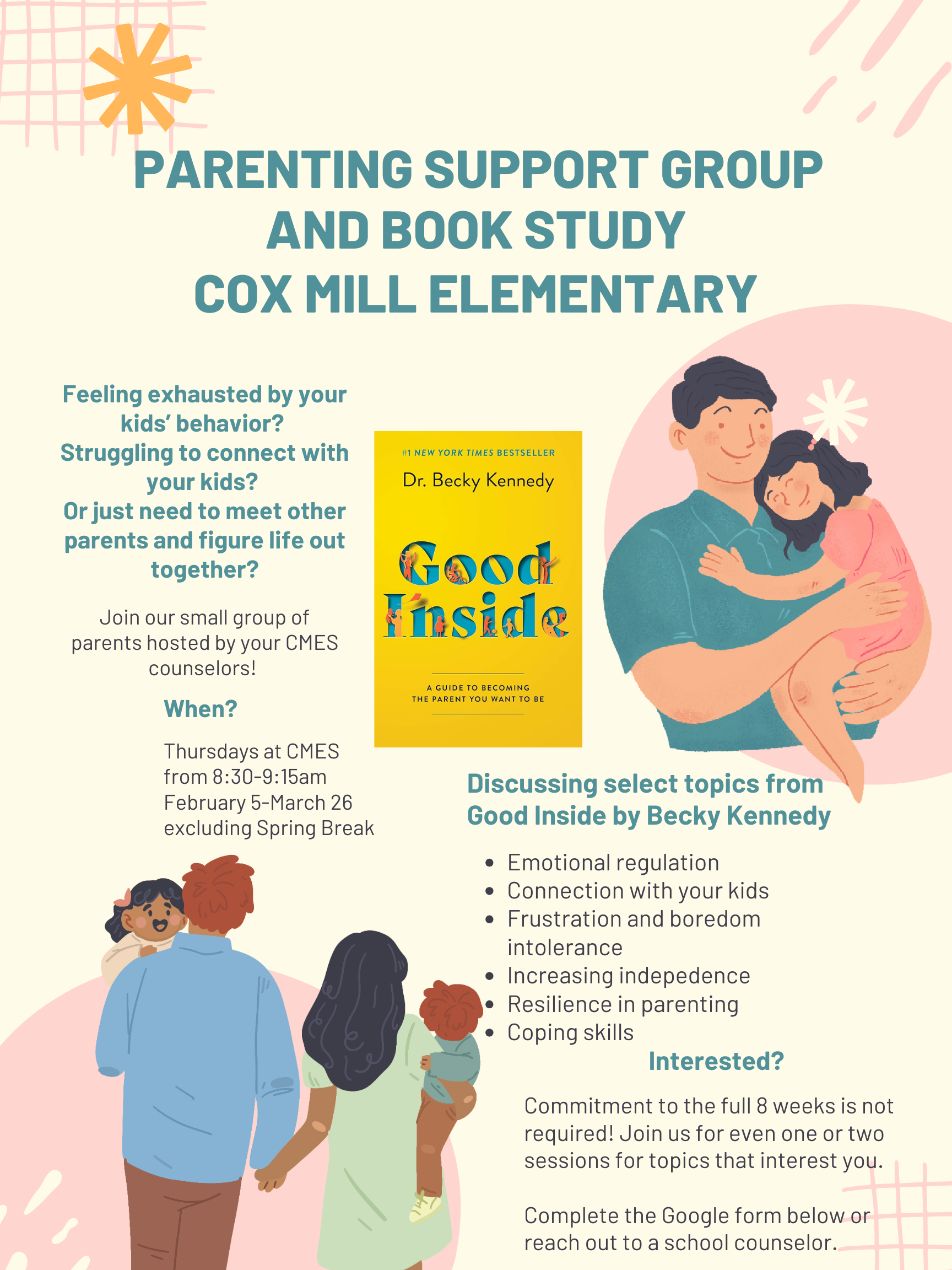 PARENTING SUPPORT GROUP AND BOOK STUDY @ Cox Mill Elementary*Feeling exhausted by your kids' behavior?*Struggling to connect with your kids?*Or just need to meet other parents and figure out life t...